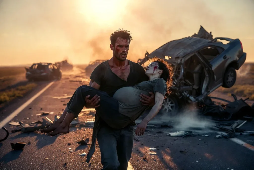 Miré por el espejo retrovisor, luego por la ventanilla, y lo vi. A unos cincuenta metros de mi posición, un auto deportivo de lujo, destrozado e irreconocible, yacía volcado a un lado de la carretera, con el capó humeando y las luces delanteras parpadeando débilmente. El aire se llenó con el olor acre a gasolina y caucho quemado.