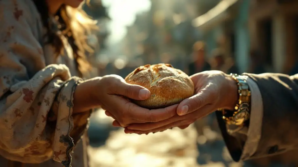 La niña levantó la vista, asustada por la imponente figura que se cernía sobre ella. Sus manos pequeñas y ágiles tomaron uno de los panes más grandes y se lo ofrecieron con timidez.