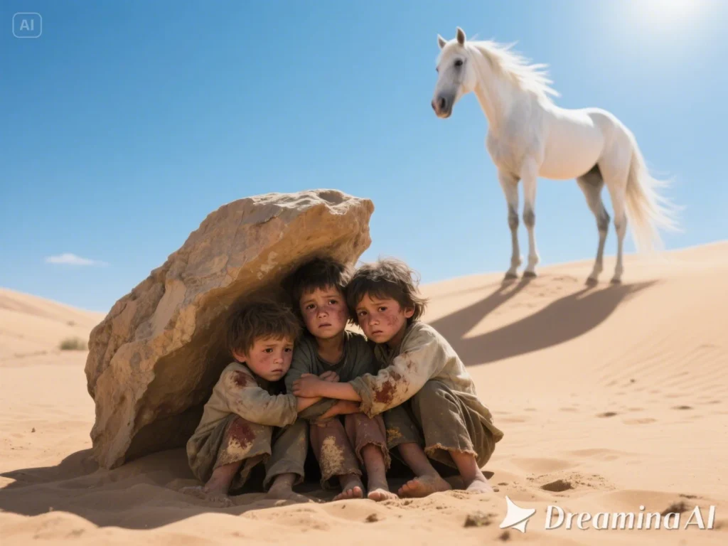 En lo alto de una duna, casi como una aparición, una figura se recorta contra el cielo azul cegador. Es un caballo blanco, puro como la nieve, con una melena que fluye con la brisa caliente. No es un animal salvaje cualquiera; su porte es noble, y sus ojos, grandes y profundos, reflejan una inteligencia inusual. Él lo vio todo. Observó la llegada del coche, la escena del abandono, la partida cobarde. Había sido el testigo mudo de toda la traición. Y ahora, observaba a las pequeñas víctimas con una intensidad que no era la de un simple animal curioso.
