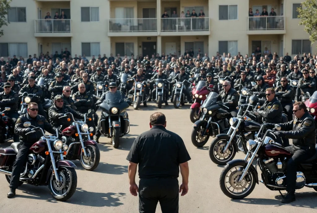 A las 3 de la tarde de ese domingo, el aparcamiento frente al edificio donde vivía el padrastro de Mateo estaba completamente lleno. 47 motocicletas. Desde Harleys hasta Kawasakis. Todas alineadas, todas con sus motores encendidos, creando un rugido ensordecedor que hacía vibrar las ventanas.