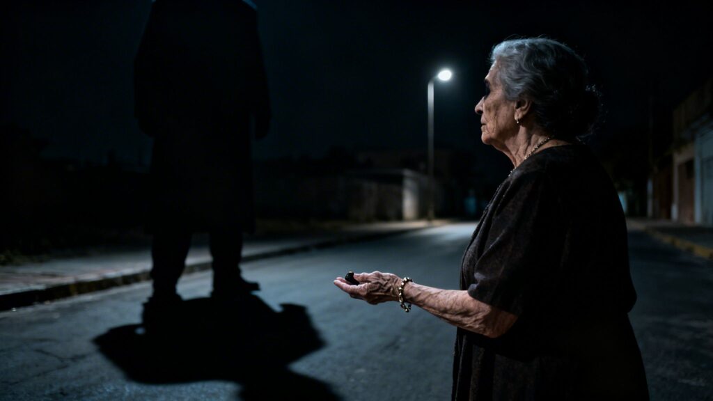 La noche era un manto espeso sobre el barrio El Jardín. Las farolas, distantes y amarillentas, apenas rasgaban la penumbra que se tragaba las sombras de los árboles. Doña Elena, con sus 82 años a cuestas y la vista perdida hace ya una década, avanzaba con la familiaridad de quien conoce cada grieta del asfalto.