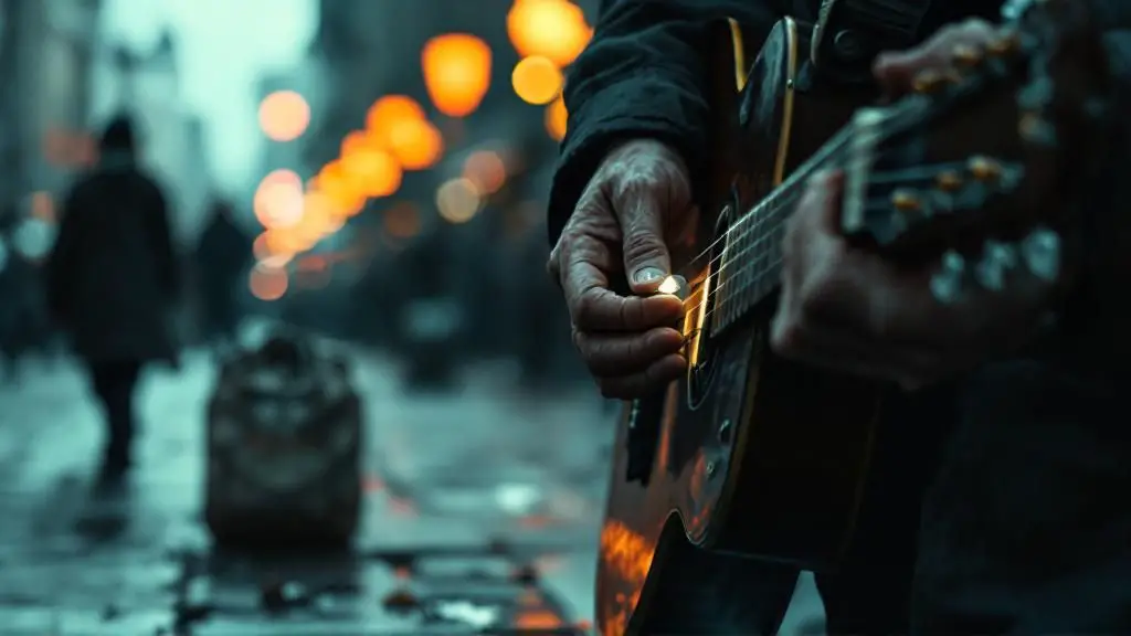 Era una tarde de esas que el invierno londinense muerde con saña, una que se clavaba en los huesos incluso a través de las gruesas capas de ropa que John, un veterano de guerra, se esforzaba por mantener limpias. Su puesto, un rincón protegido por la marquesina de una tienda cerrada, le ofrecía una mínima tregua del viento gélido que azotaba Regent Street. Con su guitarra acústica, un instrumento viejo y abollado que había sido su única compañera fiel durante la última década, intentaba arrancarle melodías a las cuerdas desafinadas. Sus dedos, nudosos y encallecidos por años de frío y trabajo duro, se movían con la familiaridad de quien ha encontrado consuelo en el arte.
