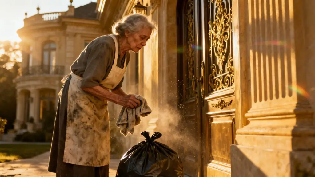 Una señora, con el cabello recogido bajo un pañuelo descolorido. Llevaba un delantal de limpieza manchado y sostenía una bolsa de basura. Su espalda estaba ligeramente encorvada, sus movimientos eran lentos y pausados, como si cada paso le costara un esfuerzo monumental.