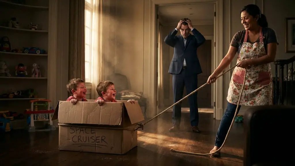 "Señor, yo… estaba guardando las cajas. Esta estaba abierta. Los niños la vieron. Yo solo… improvisé."
