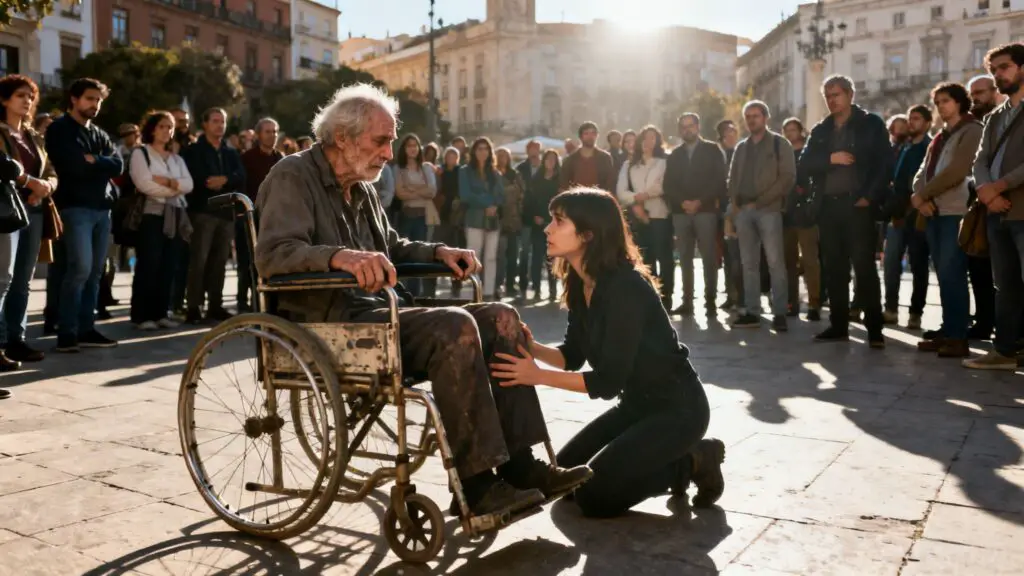 "Señor," dijo la joven, su voz suave pero firme, "si me deja orar por usted, le juro que hoy será su último día en esa silla de ruedas."