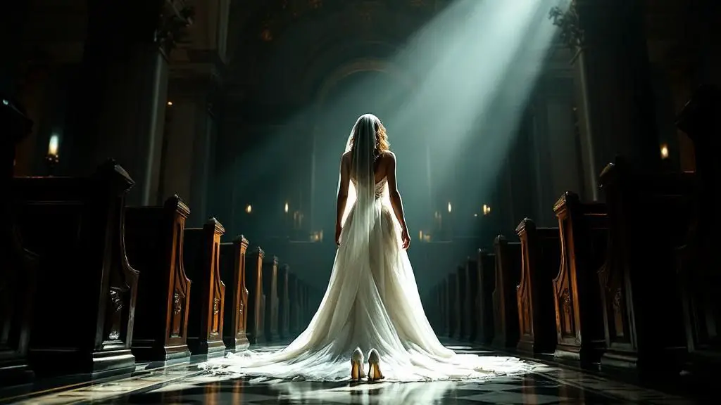 Se quitó los tacones, uno a uno, con movimientos lentos y deliberados. El 'clack' de cada zapato al caer sobre el mármol pulido de la iglesia resonó como un disparo en el silencio. Luego, con una calma que desmentía la tormenta que rugía en su interior, levantó su barbilla. Sus labios se apretaron en una línea fina. Nadie se atrevió a hablar. Nadie se atrevió a moverse.