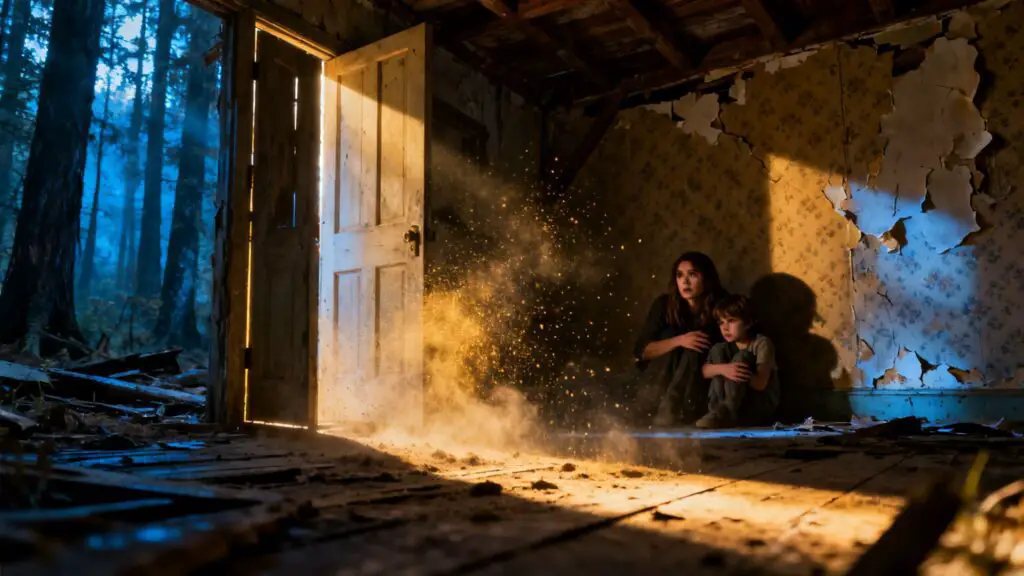 Frente a él, la cabaña parecía una boca abierta en la oscuridad del bosque. La puerta principal, de madera carcomida, estaba entreabierta.