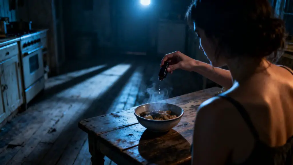 En su mano, un pequeño plato. Era la papilla que preparaba cada noche para su madre. Y en la otra, un frasco diminuto, de cristal oscuro, casi negro.