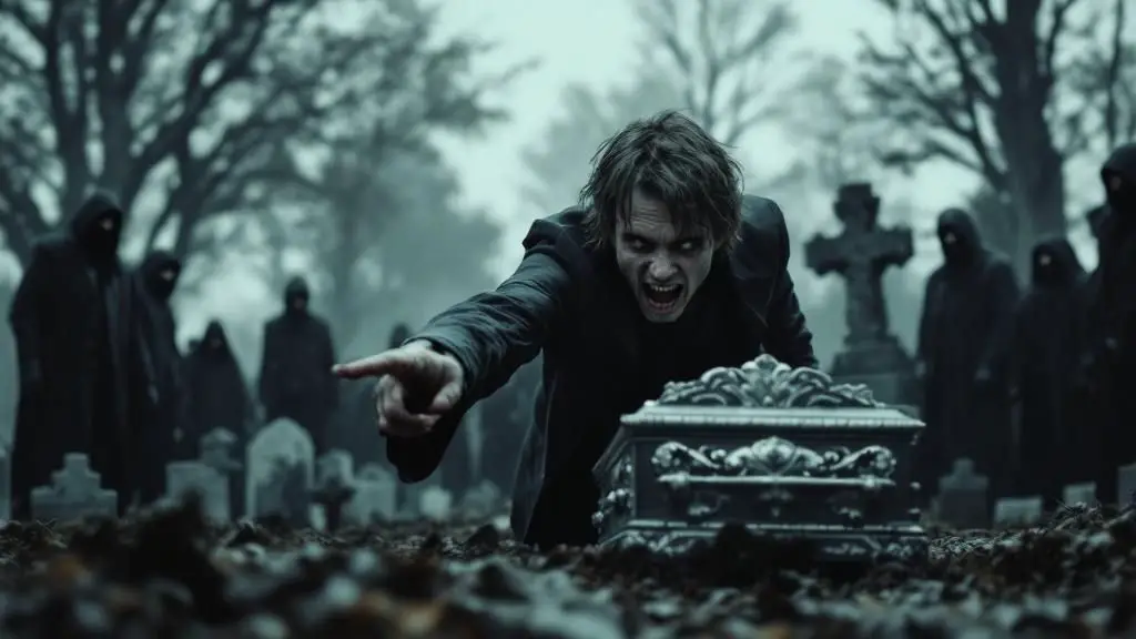 Todos los ojos se giraron. Una figura desaliñada, casi un fantasma, irrumpió corriendo entre las lápidas, con una agilidad desesperada que desafiaba la solemnidad del lugar. Era un chico, no más de veinte años, con la ropa sucia y rasgada, el pelo revuelto como un nido de pájaros y una mirada completamente desorbitada, llena de una mezcla frenética de terror y urgencia.