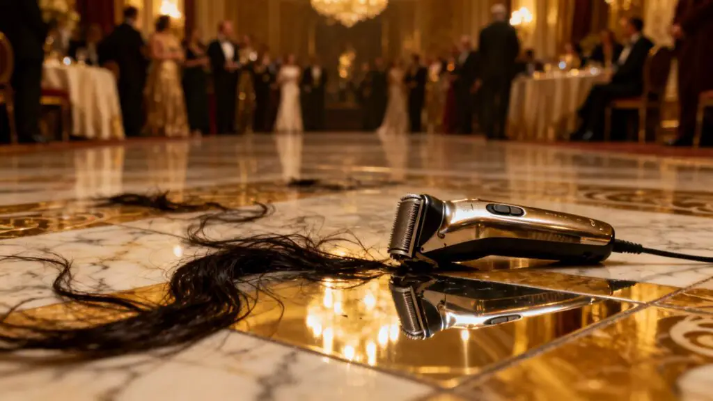 Justo en ese momento, cuando el último mechón de su frente estaba a punto de ser cortado, un pequeño objeto oscuro y plano cayó del bolsillo de Don Armando, sin que él se diera cuenta, mientras se inclinaba para terminar su cruel obra. Rodó discretamente bajo una mesa cercana, lejos de las miradas de todos.
