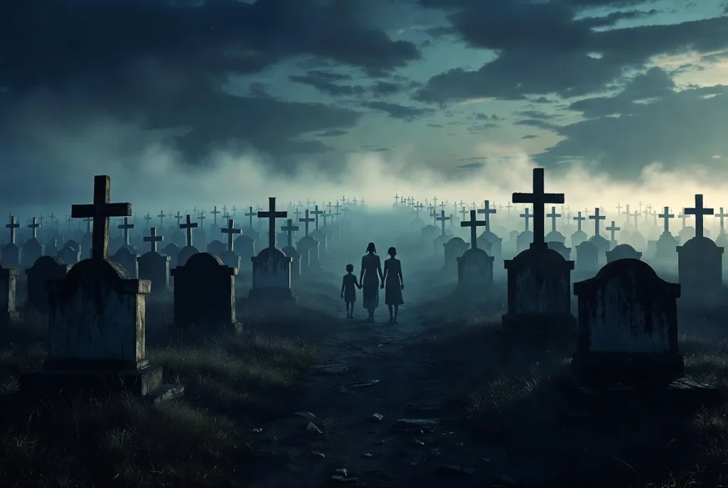 Sentí que el suelo se movía bajo mis pies. Miré alrededor buscando a mamá, pero la caseta estaba lejos. Demasiado lejos. Y entre las tumbas, la niebla empezaba a levantarse del suelo como dedos blancos.