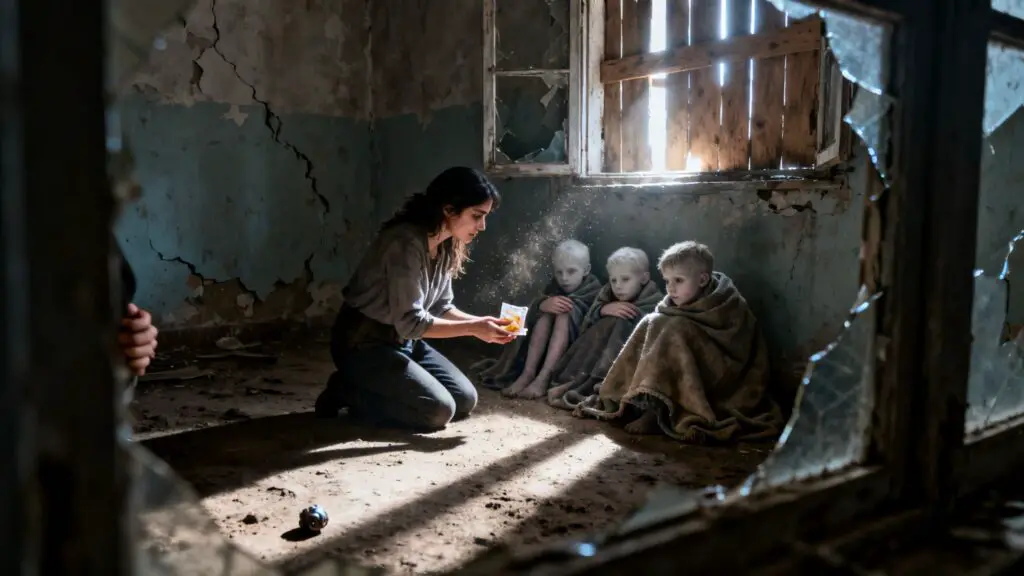 En el suelo de tierra, apenas cubiertos por unas mantas viejas y sucias, vio a tres niños pequeños. Pálidos. Temblorosos. Sus ojos grandes y vacíos.