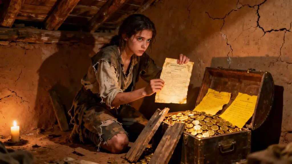 Cuando Rosa levantó la tapa, la luz que salió del cofre iluminó toda la habitación. Miles y miles de monedas de oro brillaron como pequeños soles, creando reflejos dorados en las paredes agrietadas.