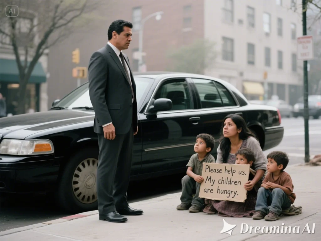 María intentó esconderlos detrás de ella, un gesto inútil y desgarrador. Su mirada ya no era de vergüenza, sino de pánico puro. Yo seguía dentro del coche, con el motor en marcha, la calorificación del luxury sedan en absoluto contraste con la escena gélida a solo un metro de distancia.